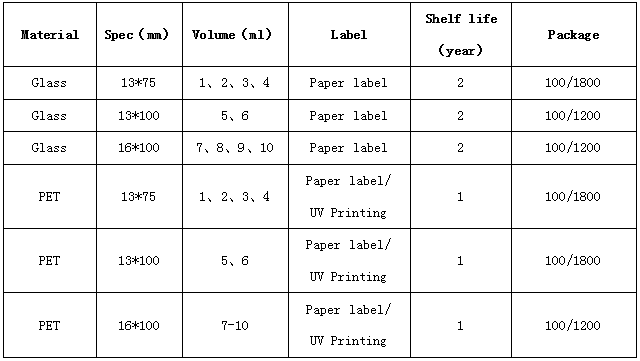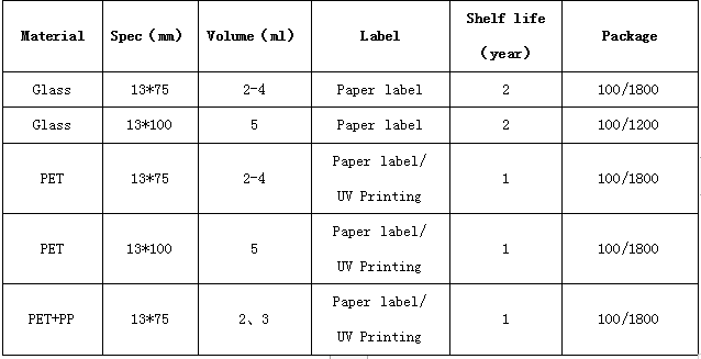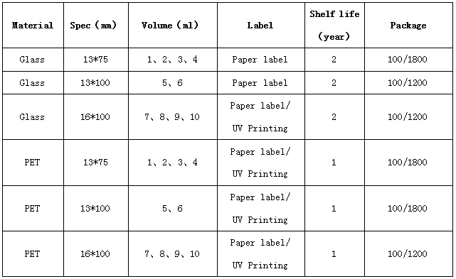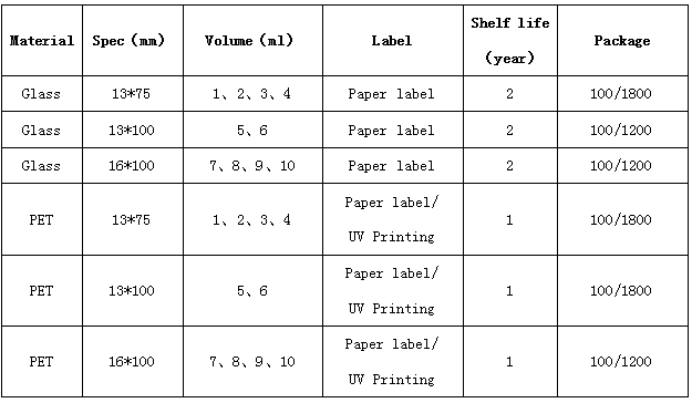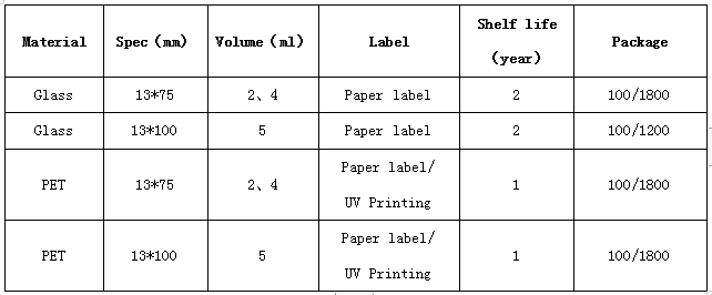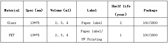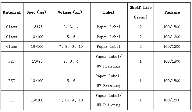 Function: No additive. This tube is used for blood specimen collection and storage for biochemistry, immunology, element trace, various types of virus detection and so on for clinical test. Plain tube shall be put in 37°C water for 1 hour after blood collection. Light yellow serum shall be visible before centrifuge.
